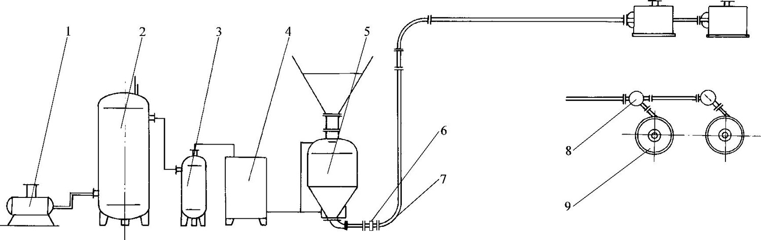 壓送式氣力輸送系統是利用壓縮空氣來吹送物料,輸料管的壓力高于大氣壓力。根據管道內壓力高于大氣壓力的程度又分高壓壓送及低壓壓送兩種。